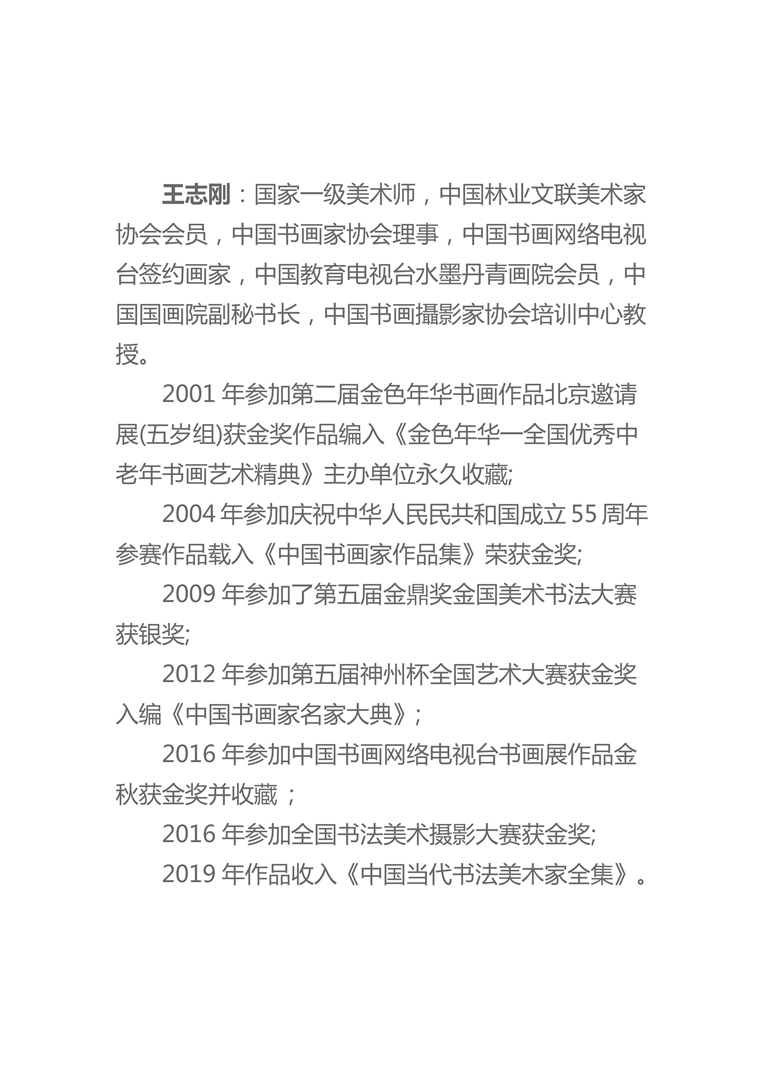 王志刚:国家一级美术师,中国林业文联美术家协会会员,中国书画家协会理事,中国书画网络电视台签约画家,中国教育电视台水墨丹青画院会员,中国国画院副秘书长,中国书画攝影家协会培训中心教授。